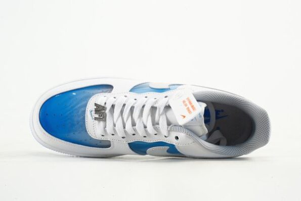 Some parts of the upper area of the shoe are made of transparent or semi-transparent blue material, as if it were a clear lake water, adding a sense of vitality and freshness to the originally simple white upper, making the shoes more visually layered. The iconic Swoosh logo is presented in silver, complementing the white and blue colors. This not only highlights the brand’s identity but also adds a touch of fashion and technology to the overall look, adding a unique charm to the fresh atmosphere.