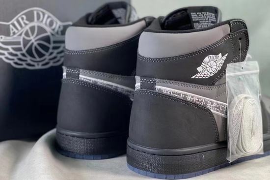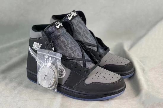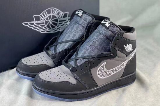 This AJ1 shoe is based on the Air Jordan 1 High, featuring black and dark gray panels, while the Swoosh on the side of the shoe features black embroidery and DI0R lettering. This pair of Air Jordan 1\’s tongue is also embossed with a letter print to highlight details. The most conspicuous design appears on the outsole. The black and white flying wing LOGO can be seen in the eye-catching blue crystal outsole, highlighting the identity of the joint names. This kind of gray and black cheap jordan shoes give a calm and generous feeling. They are not only durable, but also very good to match. You can control whether you are in sports or in ordinary wear. Jeans, overalls, and sports pants can be matched at will.