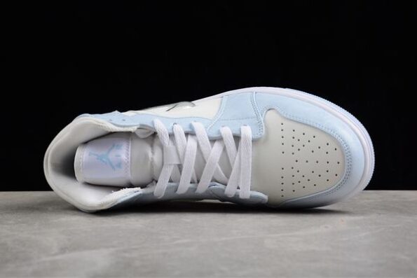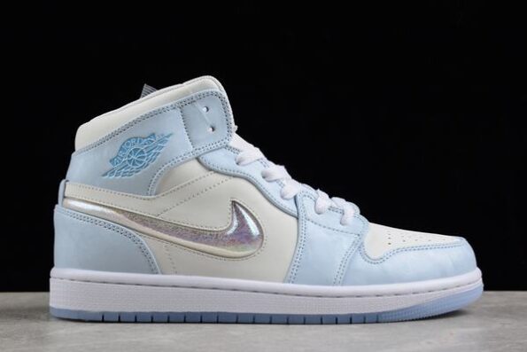 Air Jordan 1 Mid Glitter Swoosh Ice blue and silver crystal mid-top sneakers FQ9117-400. Lavender is added to the tongue of the shoe, and the powder in the transparent Swoosh moves with the upper foot. A gradual color transparent bubble style, in which powder is added, resembles a recyclable filler element. The outer Swoosh of the shoe is shaped with hourglass, the inner liner and insole are colored with white and blue, and the powder in the transparent Swoosh moves with the upper foot, the upper is ivory white and light blue, and the tongue is added with lavender.