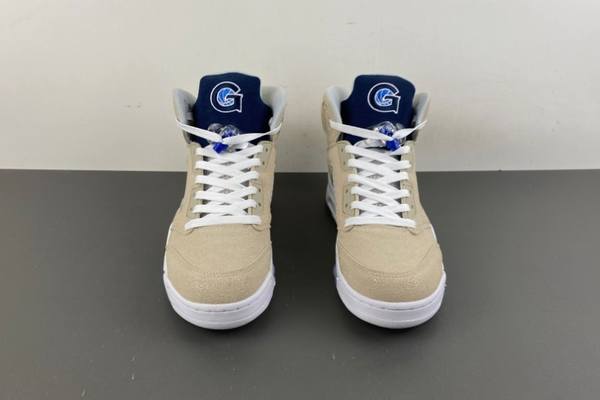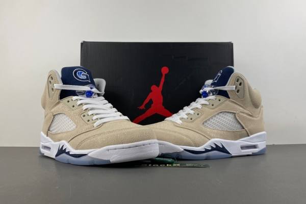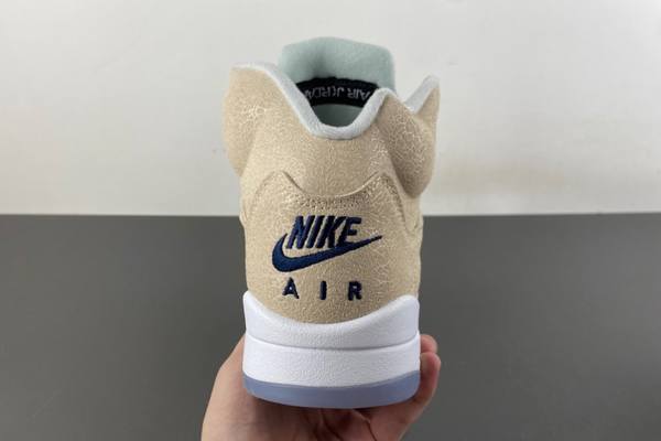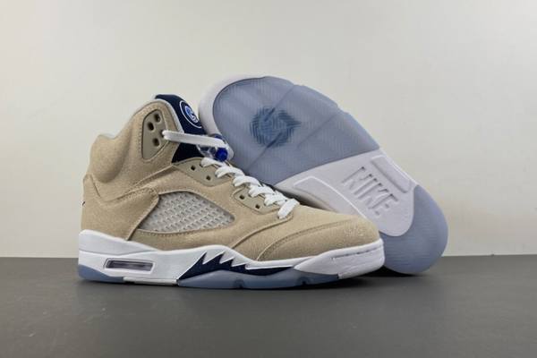 This pair of shoes features a soft beige as its main color. The upper is crafted from high-quality deerskin, offering a delicate touch and natural texture. It seems to perfectly blend the wildness and elegance of deerskin, adding a touch of luxurious retro charm to the shoe. The beige upper is paired with deep blue details (such as the tongue, upper decoration and shark tooth shape on the midsole), creating a classic color collision. It not only retains the signature outline of the Air Jordan 5, but also endows the shoe with a unique fashion recognition through the innovation of materials and colors. The brand logo on the tongue of the shoe and the blue decorative details on the upper clearly present the brand identity and become visual highlights.