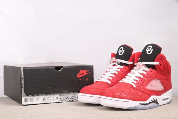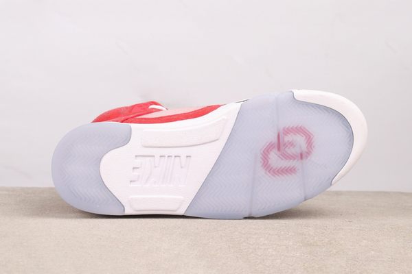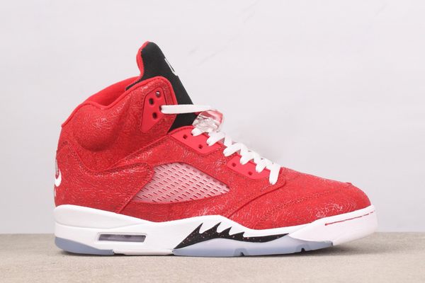 The signature breathable mesh design on the side of the shoe, set off by a red background, appears particularly exquisite. It not only ensures the shoe’s excellent breathability, allowing the feet to breathe freely while wearing, maintaining dryness and comfort, but also adds a sense of technology and fashion to the overall look. The classic shark-tooth design on the midsole is presented in black and white, creating a sharp contrast with the red upper. The lines are smooth and dynamic, not only enhancing the sporty nature of the shoes but also becoming a signature visual symbol of the Air Jordan 5 series.