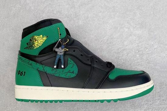 New Air Jordan 1 High x Eastside Golf 1961 AJ1 Golf co-branded high top basketball shoes FJ0849-001. The whole body is covered with cheap jordan 1 leather footwear, with the word Eastside Golf written in cursive above the Swoosh, with a black background and dark green upper. The Swoosh heel is also presented in green, with the heel split between Change and 1961 embossed to indicate the shoe theme.