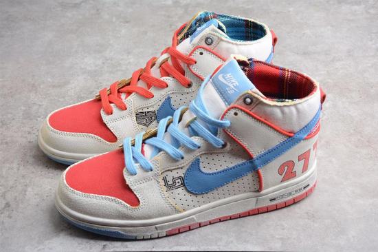 The Ishod Wair x Magnus Walker x SB Dunk High pair of shoes is dominated by a large area of white, supplemented by blue and red two-color embellishment details, and the design is inspired by Walker\’s favorite Porsche 911 T277. The body of the shoe is made of aged leather with cracks, and it is matched with the canvas material at the toe cap and the upper position. The blending of the two materials makes the body of the shoe more layered. The word \’277\’ is written on the heel, which not only highlights the identity of the joint name, but also adds a touch of eye-catching details to the shoes. The inside of the shoe body also has the words Urban Outlaw, representing the Porsche documentary \’Urban Outlaw\’ in 2013. The inner lining is presented in red and green plaid, which is also Magnus Walker\’s favorite daily clothing, once again showing his special identity. Finally, it ends with a white outsole with wearing traces, and the word \’SB\’ is written in Porsche font on the heel to complete the overall shape design.