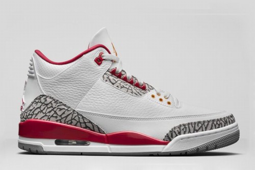 White, light curry, cardinal and cement grey color scheme. This Air Jordan 3 is expected to resemble the Air Jordan 7 \’Cardinal\’ that was last seen in 2011. The shoe features a white leather upper with signature elephant print overlays and Cardinal Red accents on the eyelets, lining and midsole. Other details include bronze accents on the Jumpman tongue and bottom eyelets.