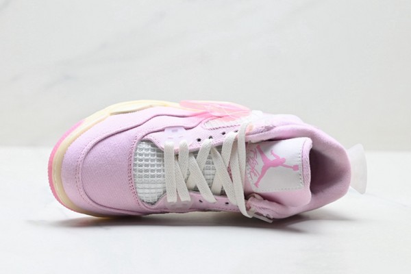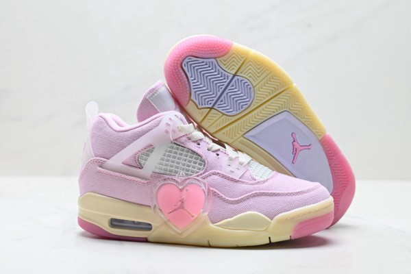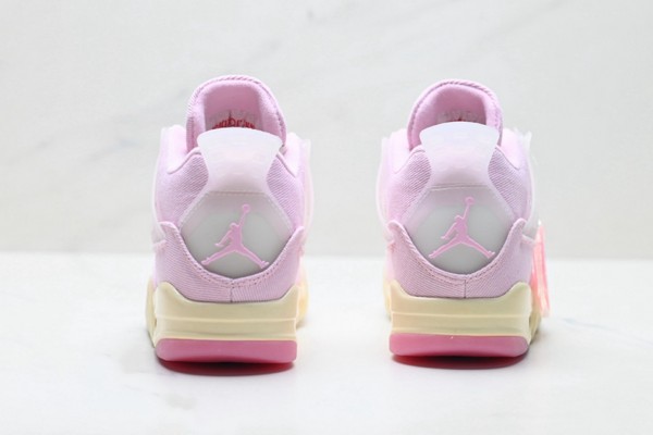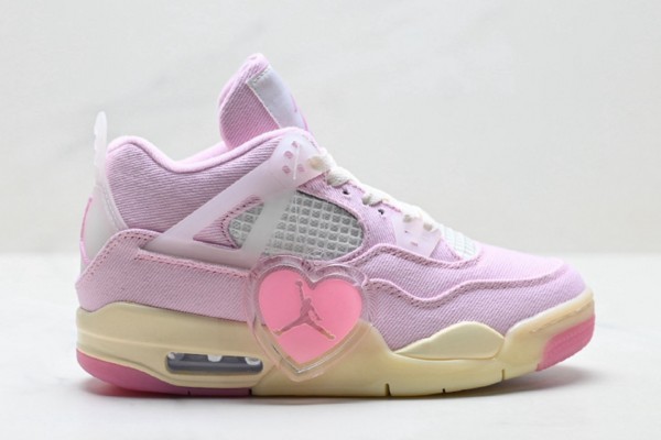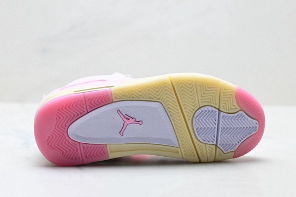 Based on the classic mid-top silhouette of the Air Jordan 4, this shoe retains the iconic toe curve and layered upper. The upper features high-quality leather panels: pink leather covers the toe, sides, and heel, its delicate texture reminiscent of silk dyed with cherry blossoms, offering a gentle and sophisticated feel. The Swoosh logo on the side is presented with a smooth curve, preserving the classic design while injecting a touch of vibrancy. The “Carmine Red” lettering on the heel is embossed on the pink leather, highlighting the shoe’s unique identity.