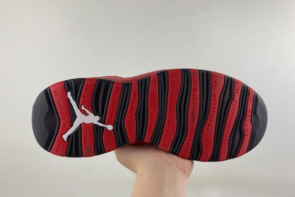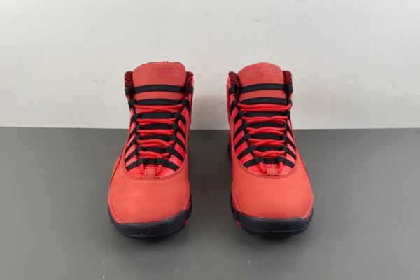 The lines that encircle the side of the shoe, recording the glorious moments of Jordan’s career, have become the iconic symbol of the Air Jordan 10 and stand out particularly against the backdrop of red. The lacing system is uniquely designed. The black LACES contrast sharply with the red upper. It is not only sturdy and durable, but also fits the feet closely to ensure comfort and stability when wearing. Moreover, the color combination enhances the layering of the shoes. The Jumpman logo on the tongue and heel of the shoe is exquisitely crafted, subtly yet clearly highlighting the identity of the Jordan brand.