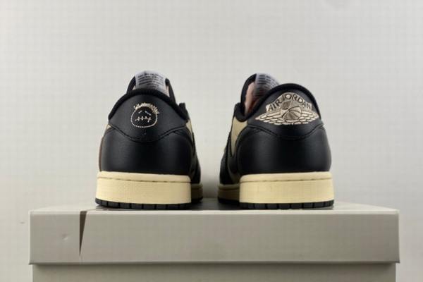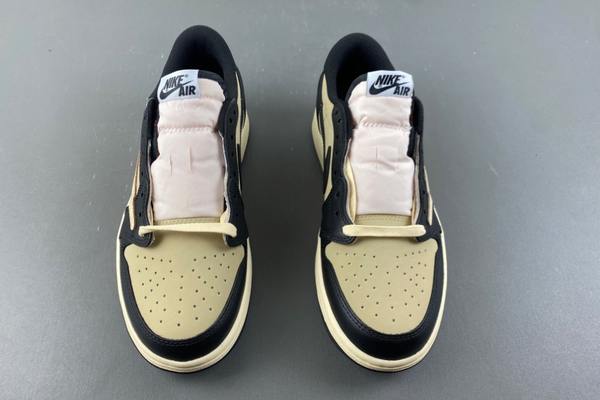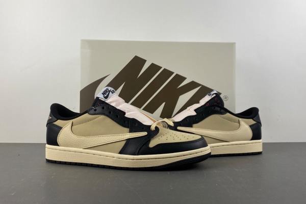 Travis Scott x Air Jordan 1 Khaki Black covers the upper with a combination of khaki leather, black matte material and off-white midsole. The fine texture of khaki leather and the matte texture of black matte create a distinct material contrast, continuing the classic low-top silhouette of Air Jordan 1. It also breaks the traditional color layout of shoes through Travis Scott’s signature “reversal” visual logic, highlighting a more casual street style. The Swoosh on the side of the shoe extends in khaki to the inside of the shoe, complemented by the classic Nike label on the tongue, enhancing the collaborative recognition. The aged beige midsole, with its own retro “dressing filter”, gives the shoe a relaxed atmosphere even before wearing it.