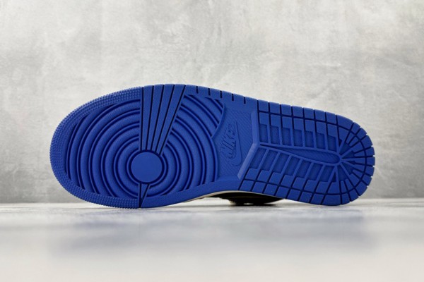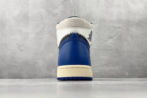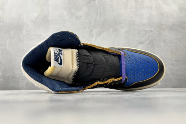 This shoe uses the classic high-top silhouette of the Air Jordan 1 High as its base, retaining the iconic toe curve and layered upper. The upper features high-quality leather patchwork: black leather covers the toe, sides, and heel, offering a sophisticated and understated look; royal blue leather covers the midfoot and heel, its vibrant color echoing Fragment’s design energy and contrasting sharply with the black. The off-white Nike Swoosh, presented in leather, has a smooth curve, preserving the classic design while injecting a retro vibe. The white plush lining on the heel is a striking detail, mimicking Union’s craftsmanship, enhancing comfort and adding depth to the overall design.